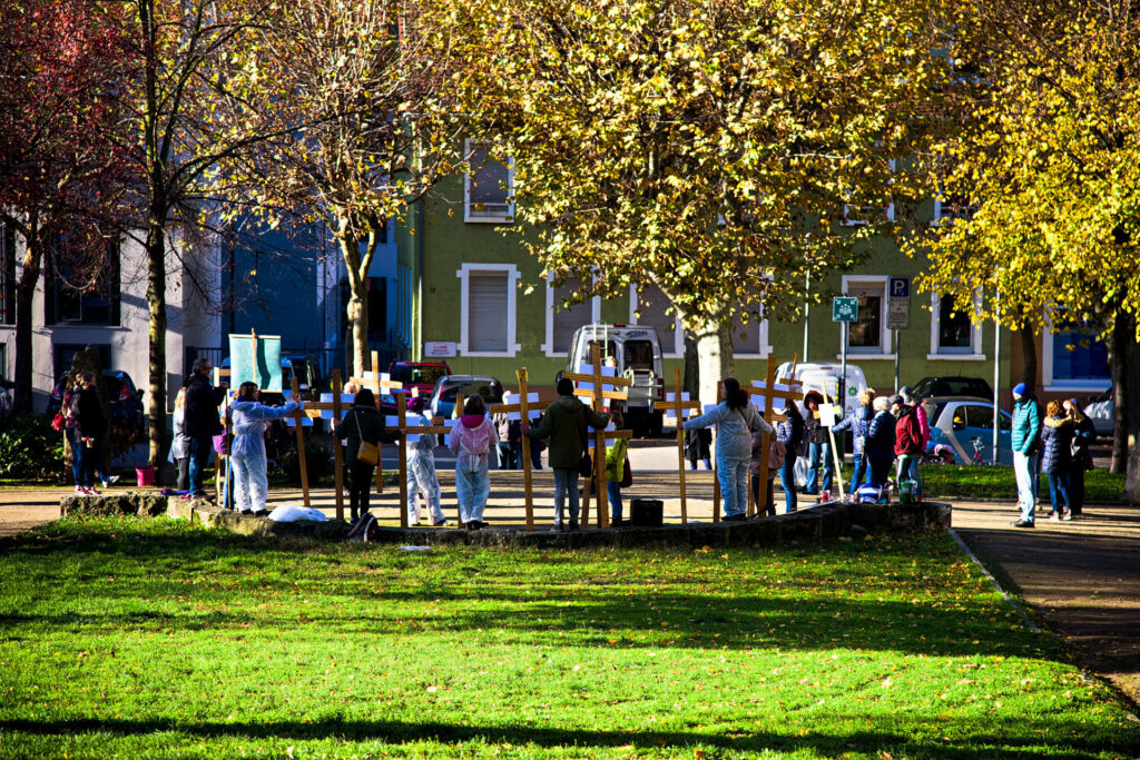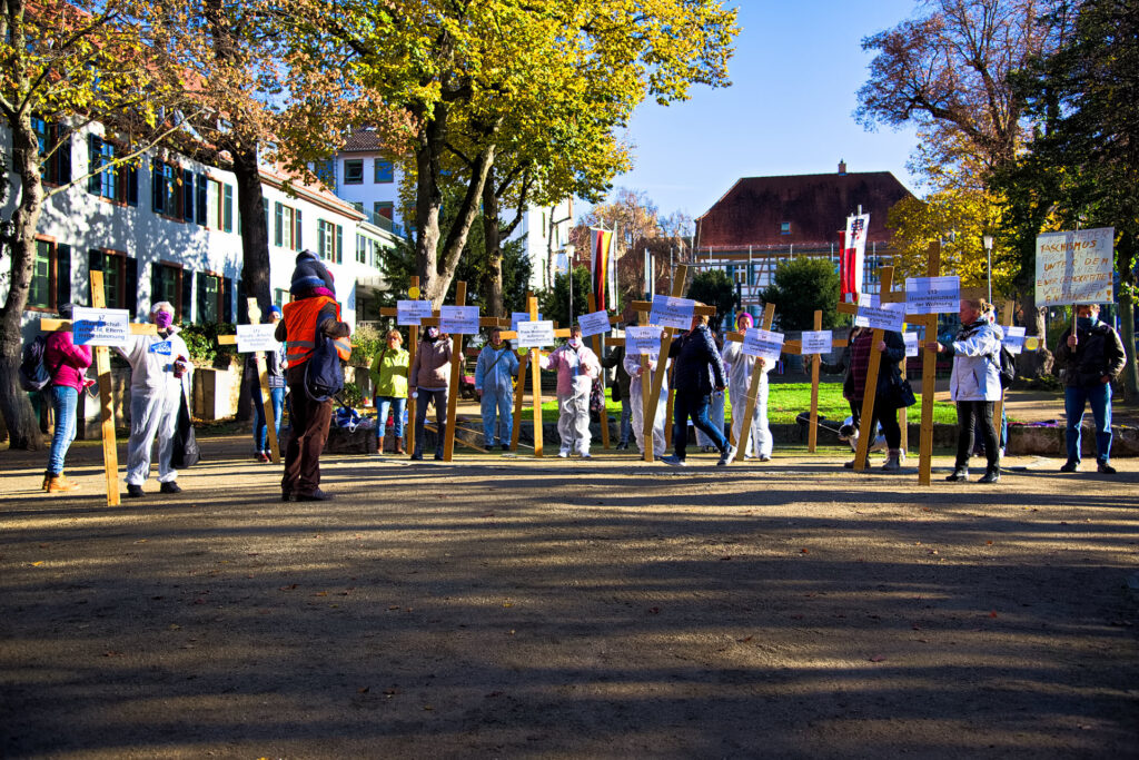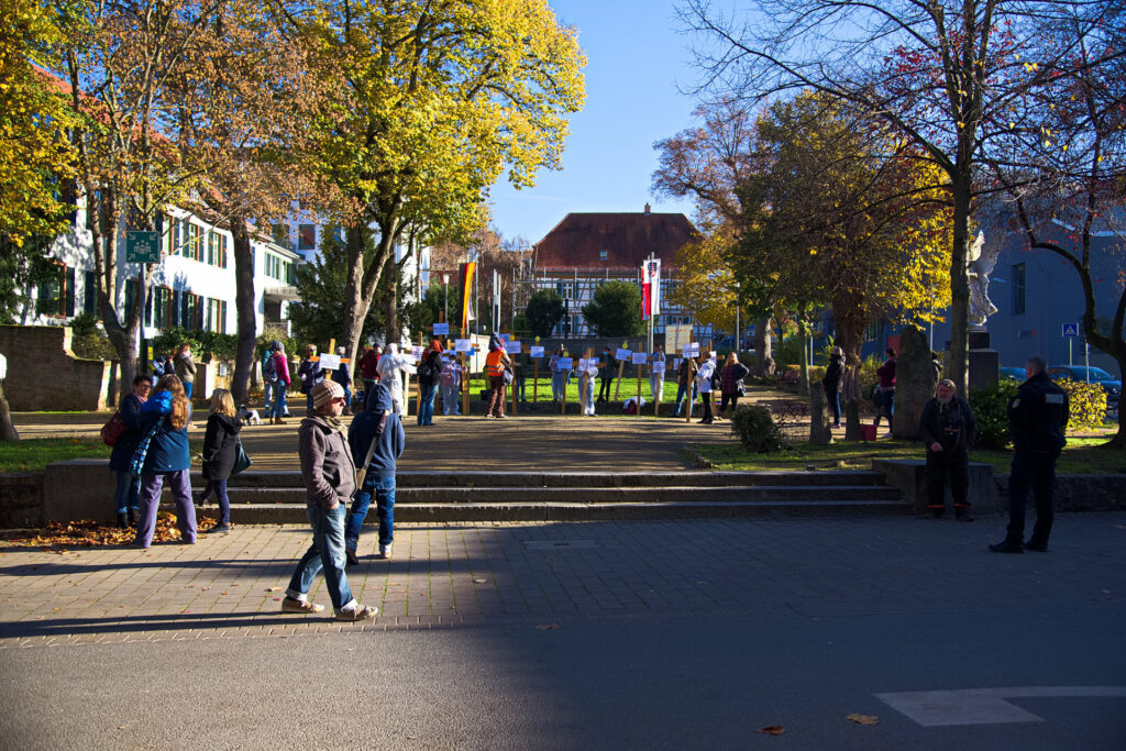 Parallel zur Großdemo in Berlin (Infos dazu im Filmbeitrag hier) trafen sich ca. 100 Menschen vor dem Landratsamt in Heppenheim, um gegen den Beschluss des IFSG (Infektionsschutzgesetz) zu demonstrieren. Wir standen mit Kreuzen, die das Begräbnis der Grundrechte symbolisierten, es gab ein paar Reden – jedoch leider ohne Mikrofon. Rüdiger stellte die soziale Dreigliederung vor als Alternativmodell der Gesellschaft. Wir hatten den Landrat eingeladen, der auch tatsächlich herauskam und mit uns sprach – er wollte uns beschwichtigen, dass es kein Problem für unseren Rechtsstaat sei mit dem Gesetz.