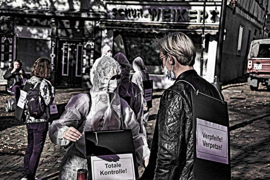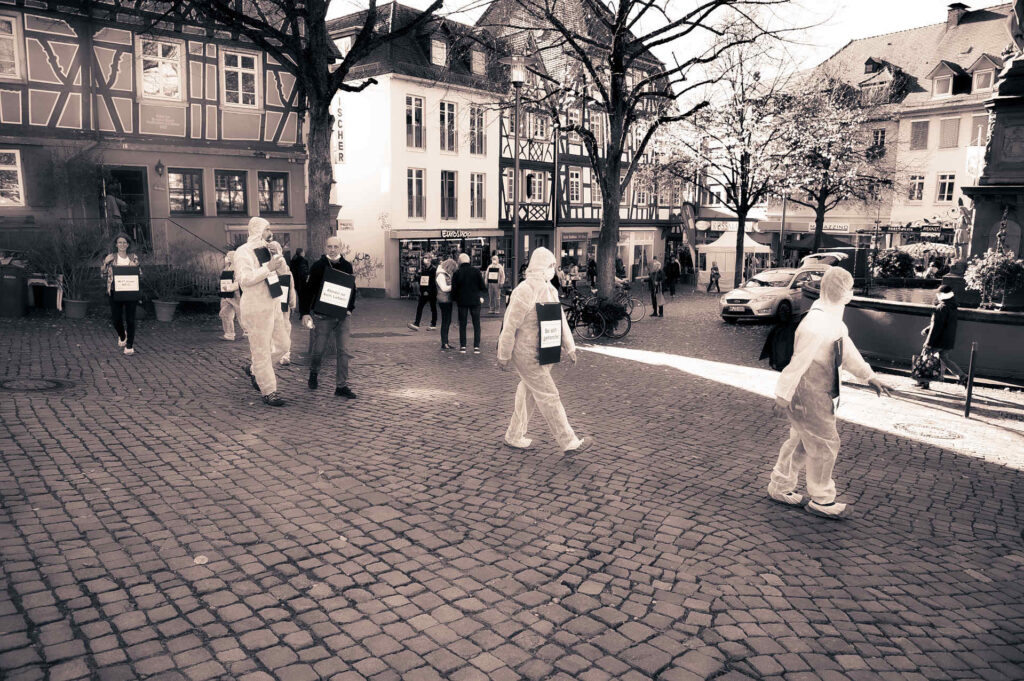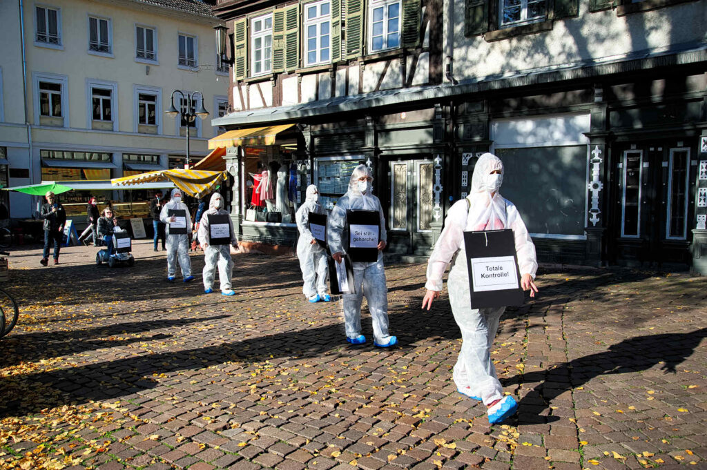 7.11.2020 Demo in der Innenstadt Bensheim, mit weißen Anzügen und Schildern